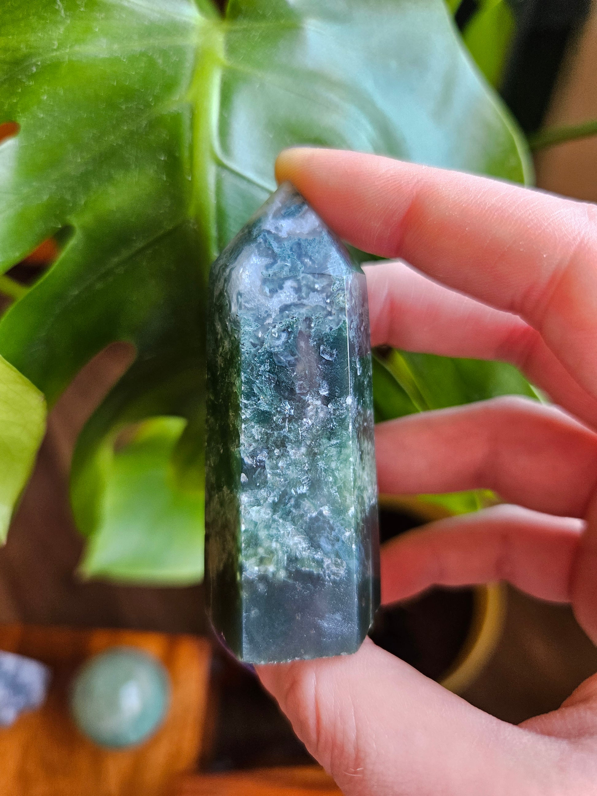 Small Moss Agate polished crystal point. Gorgeous patterns and swirls.